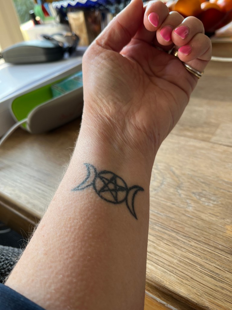 Ik heb een afbeelding van the triple Goddes op mijn arm getatoeëerd waarbij er een pentagram in de cirkel staat. Gewoon omdat ik het mooi vind en omdat het hetgeen symboliseert waar ik voor sta.